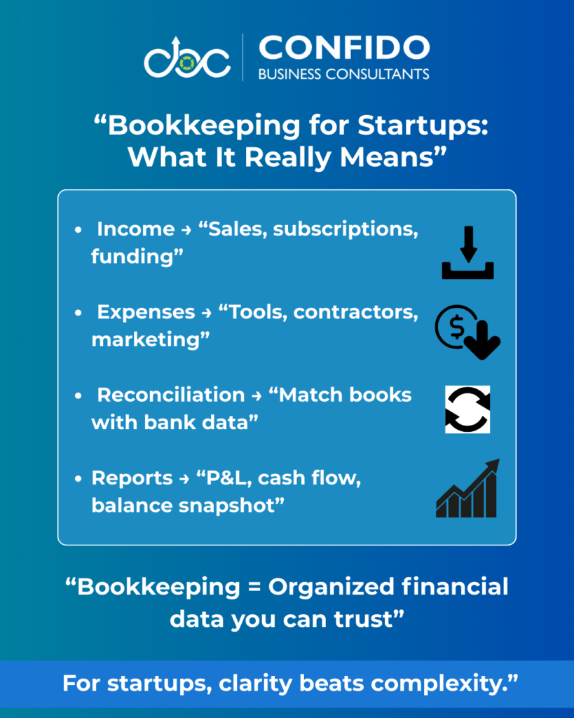What Bookkeeping Means for Startups (in Simple Terms)At its simplest, bookkeeping is the process of recording, organizing, and maintaining your startup’s financial activity—so you always know what you earned, what you spent, and where you stand financially. For startups, bookkeeping is not about complex accounting theory. It’s about building a clean, reliable financial record from day one. Bookkeeping vs. Accounting (Plain English)Founders often use these terms interchangeably, but they’re not the same: