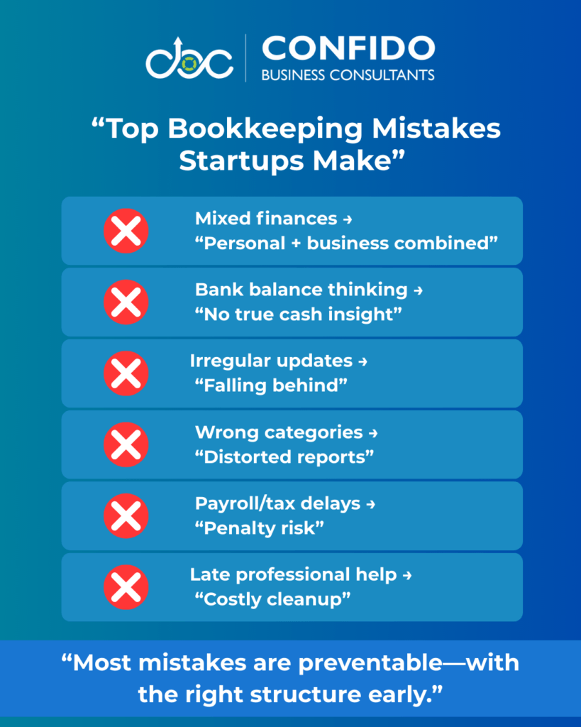 Common Bookkeeping Mistakes Startups MakeMost bookkeeping problems startups face aren’t caused by complexity—they’re caused by small, repeated mistakes made early and left uncorrected. These issues often stay hidden until tax season, fundraising, or a compliance notice forces attention. Below are the most common bookkeeping mistakes U.S. startups make—and why avoiding them early matters. Mixing Personal and Business ExpensesThis is the single most frequent error among early-stage founders. Common scenarios include: