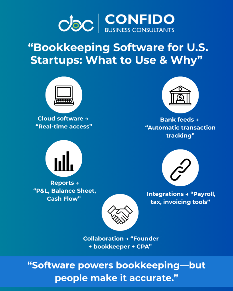 Bookkeeping Software for U.S. Startups (QuickBooks, etc.)For most U.S. startups, bookkeeping software is the engine behind day-to-day financial tracking. The right tool doesn’t just record transactions—it makes compliance easier, reporting clearer, and collaboration smoother as your startup grows. The key is choosing software that fits your stage, complexity, and future plans. Why Most U.S. Startups Use Cloud-Based SoftwareModern startups rarely use spreadsheets alone—and for good reason. Cloud-based bookkeeping tools allow you to: