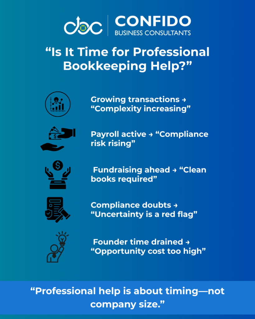 As complexity increases, founder-managed bookkeeping often becomes inefficient and risky.