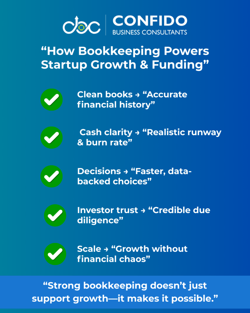 How Proper Bookkeeping Supports Growth & FundingFor many startups, bookkeeping is treated as a back-office task—something that exists to “keep things compliant.” In reality, proper bookkeeping is a growth enabler. It directly influences how confidently you can scale, raise capital, and make strategic decisions. Here’s how clean, consistent bookkeeping supports startup growth and funding in practical terms. Gives You Clear Visibility Into Cash and RunwayGrowth decisions depend on one question: How long can we operate at our current pace? Proper bookkeeping provides:
