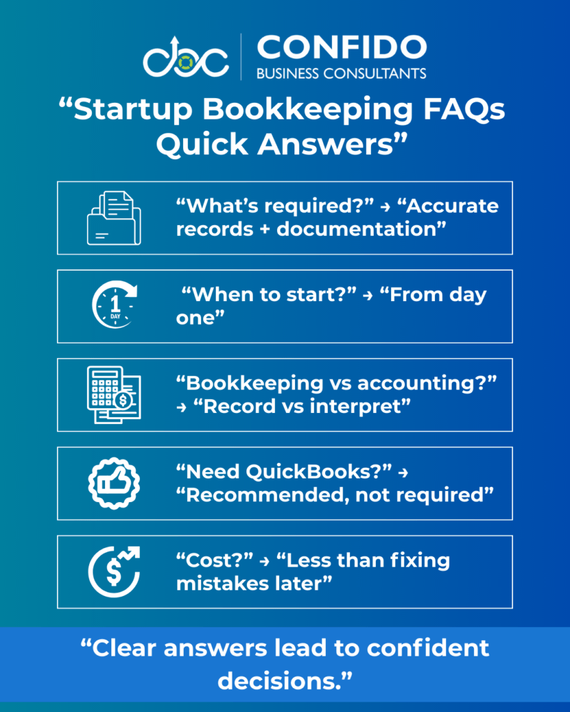FAQs: Bookkeeping for Startups in the U.S.Below are clear, founder-friendly answers to the most common questions startups have about bookkeeping in the U.S. These address legal requirements, cost, timing, tools, and risk—so you can move forward with clarity, not guesswork. What bookkeeping is legally required for startups in the U.S.?U.S. startups are required to maintain accurate and complete financial records that support tax filings, payroll reporting, and compliance with federal and state regulations. While there’s no single “bookkeeping law,” authorities such as the Internal Revenue Service expect businesses to keep records of income, expenses, payroll, and supporting documents for several years. At a minimum, startups must be able to substantiate: