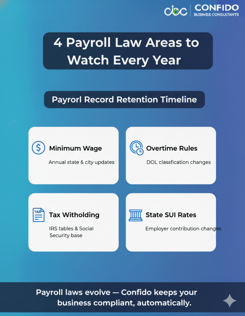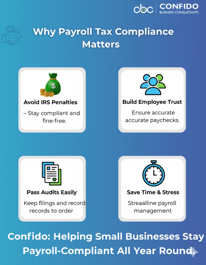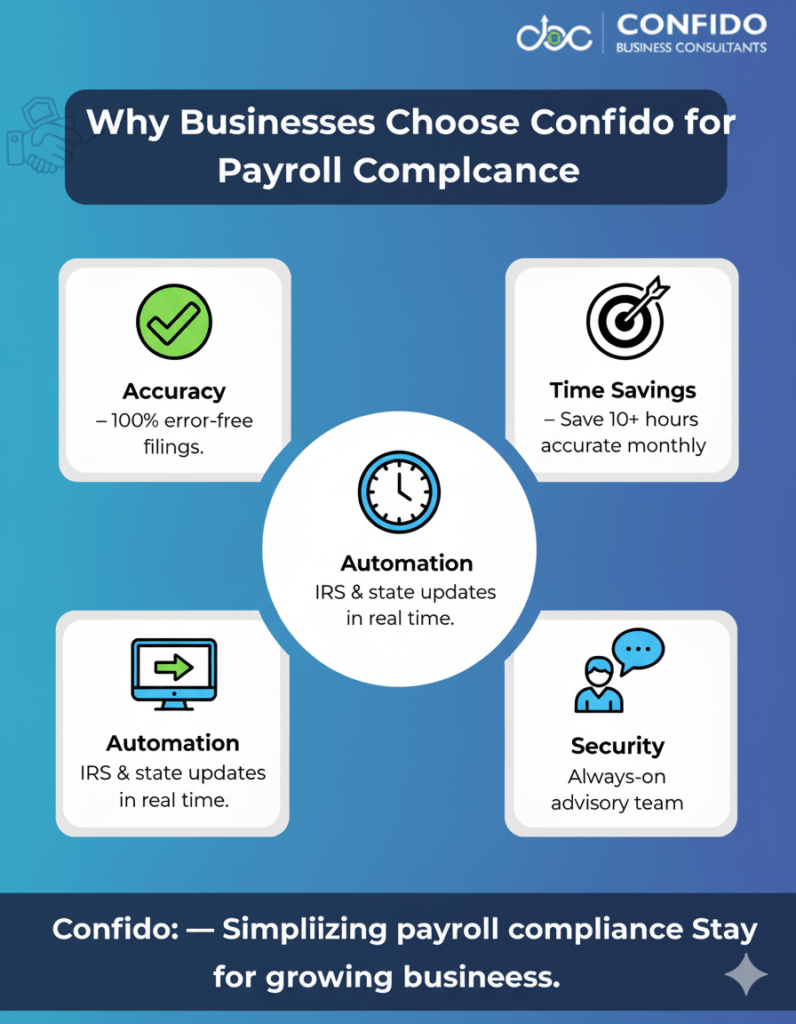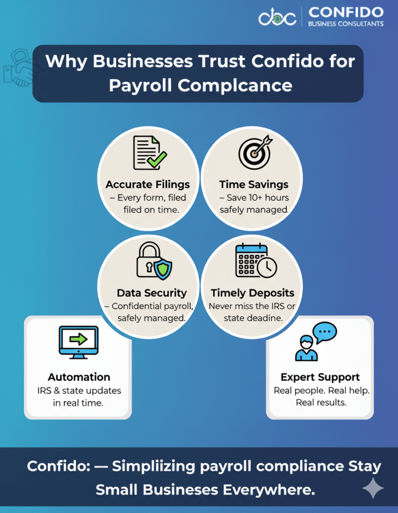 💡 Tired of worrying about tax deadlines, filings, and audits? Talk to Confido and let our experts handle your entire payroll compliance — from calculations and deposits to IRS and state filings — so you can focus on growing your business.
