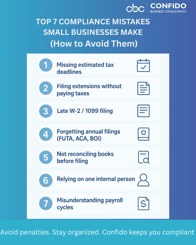 Need help with IRS filings, payroll tax deadlines, or compliance reminders? Confido ensures nothing slips through the cracks — ever. Get in touch to stay compliant year-round.