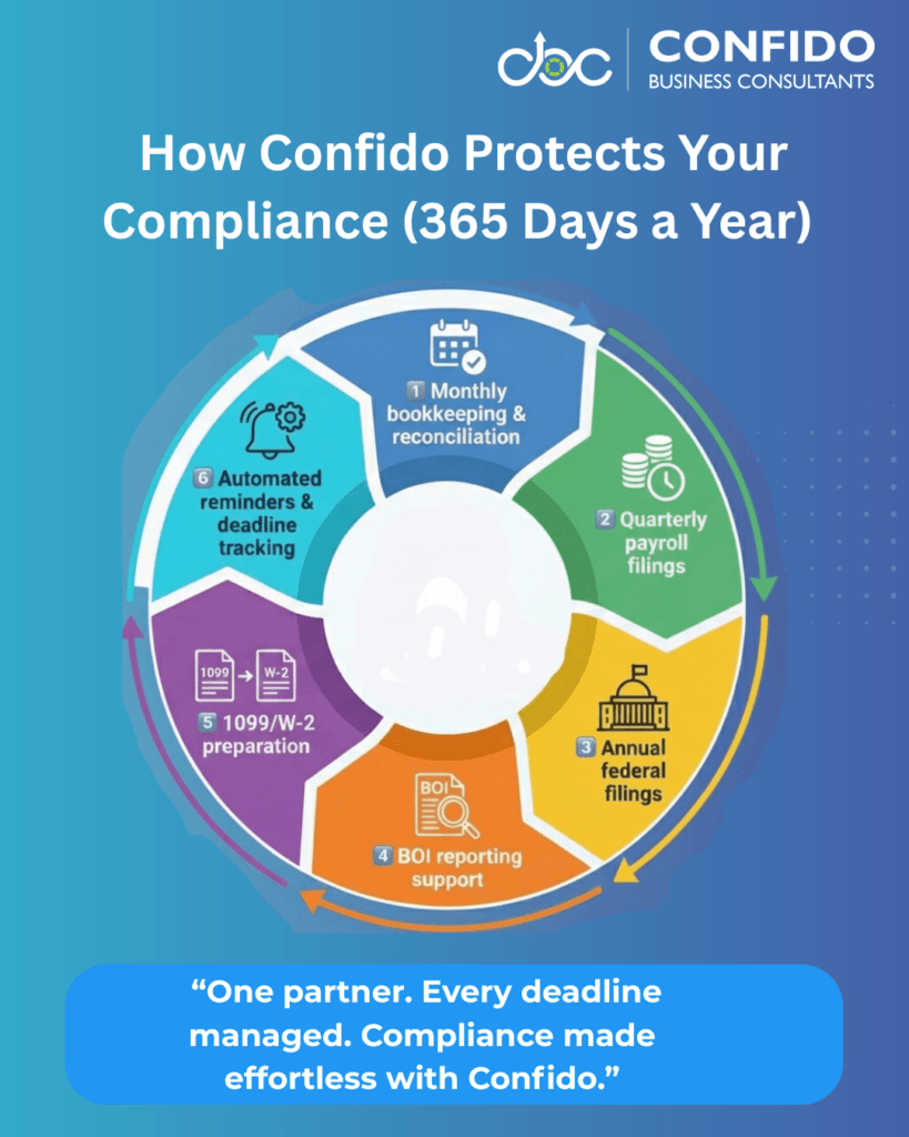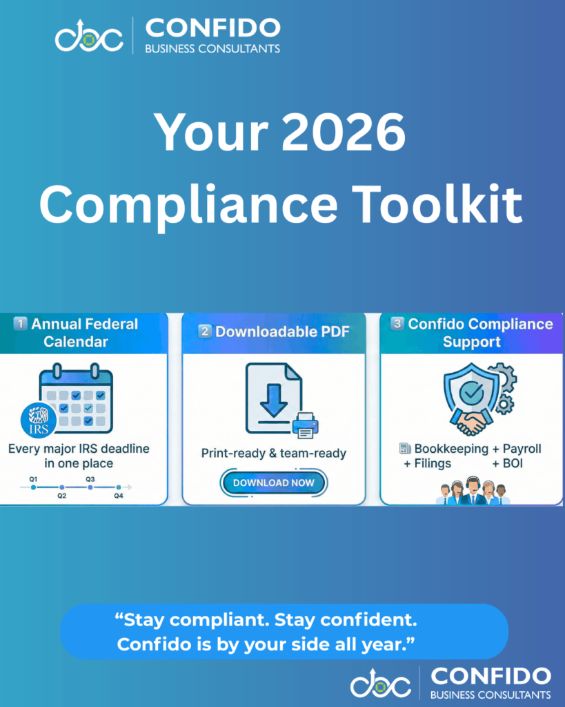 If you want 2026 to be the year you stop worrying about IRS deadlines, payroll filings, BOI reporting, and tax documents, Confido is your year-round compliance partner. Let our team handle every deadline — so you can focus on growing your business. Book a consultation to get started.