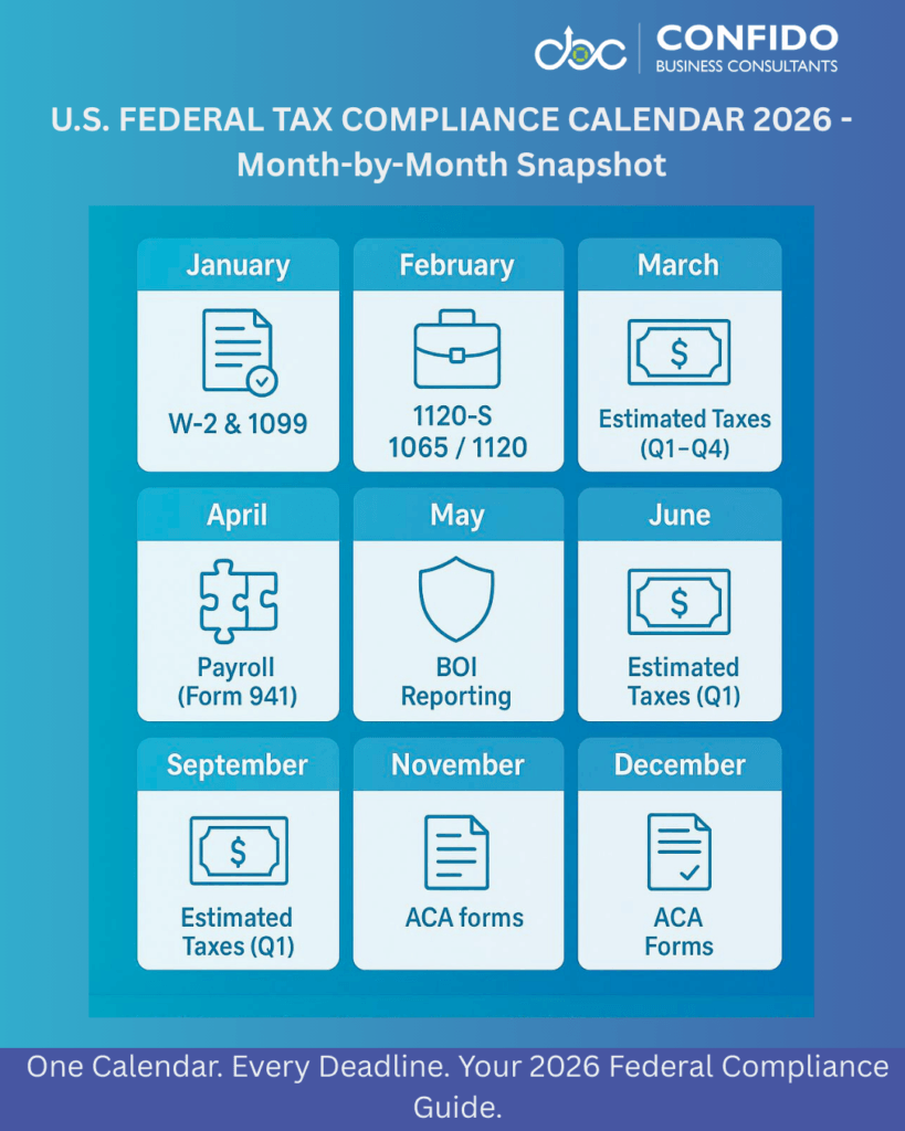 Whether you’re a small business owner handling your own filings, a startup preparing for your first U.S. tax year, or an established company wanting a clean compliance workflow, this calendar acts as your 2026 federal compliance roadmap.