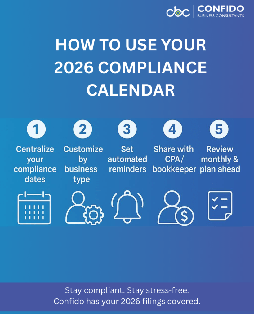 If you want a State Compliance Calendar 2026, Confido can prepare one for your state(s) on request.